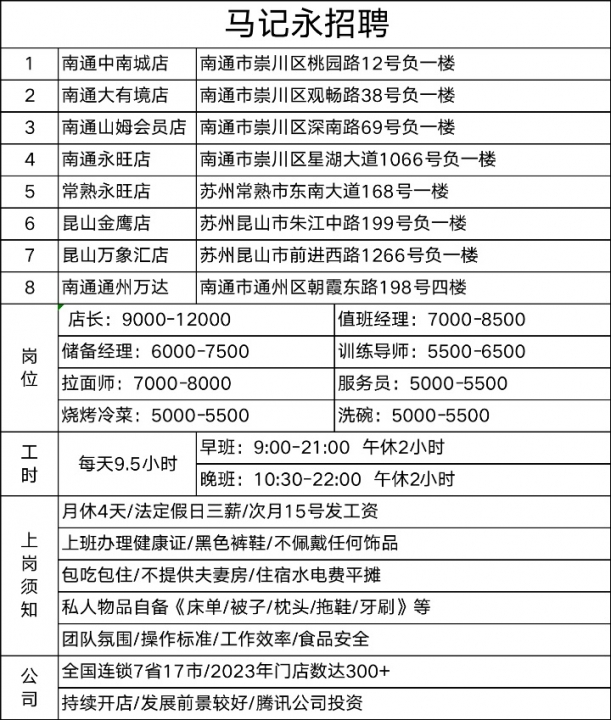 马记永招聘工作地址:江苏南通上班时间:9.5小时招聘岗位:拉面师《底薪7000》《法定假日一天480》《休息4天,加班260一天》另招二把手/学徒/厨工/服务员包吃住/回族汉族都可以门店是全国连锁,客人都是汉族,门店开在商场里面,店里没有猪肉,不卖酒。门店拉面师傅也都是回族,牛肉不带清真标,要求严格的回族师傅不合适